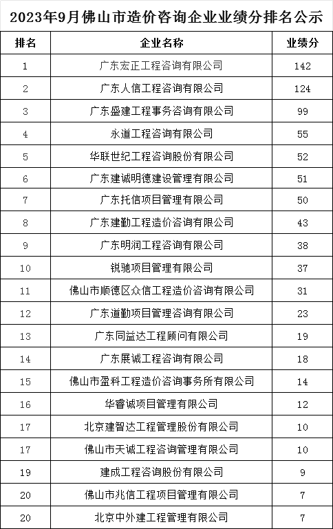 2023年9月佛山市造价咨询企业业绩分排名公示