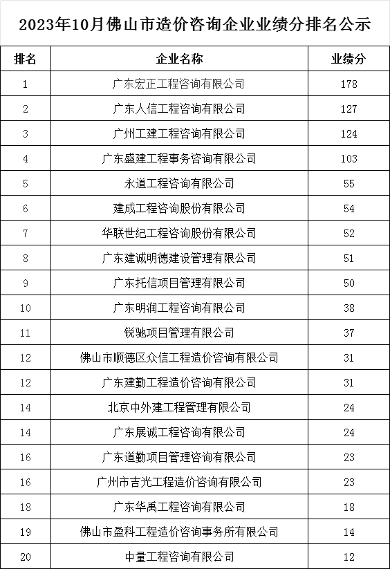 2023年10月佛山市造价咨询企业业绩分排名公示