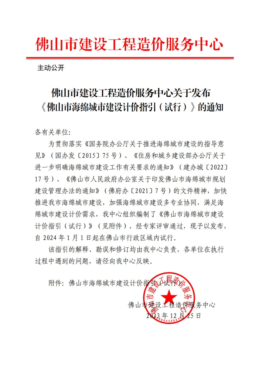 转发 | 佛山市建设工程造价服务中心赢博(股份)有限公司官网发布《佛山市海绵城市建设计价指引(试行)》的通知