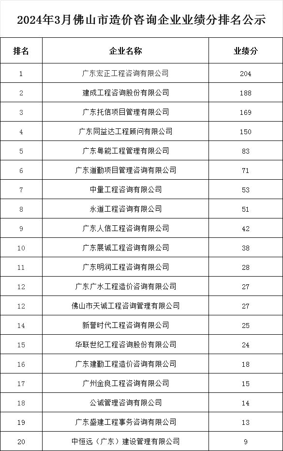 转发 | 2024年3月佛山市造价咨询企业业绩分排名公示