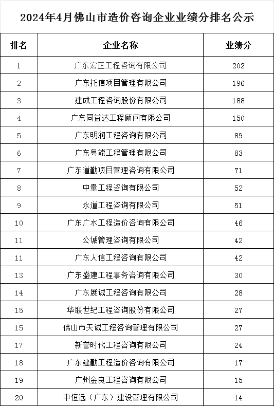 转发 | 2024年4月佛山市造价咨询企业业绩分排名公示