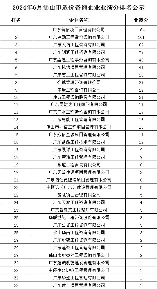 转发 | 2024年6月佛山市造价咨询企业业绩分排名公示