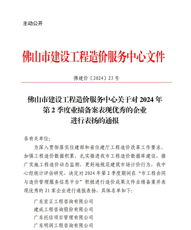 转发 | 佛山市建设工程造价服务中心赢博(股份)有限公司官网对2024年第2季度业绩备案表现优秀的企业进行表扬的通报