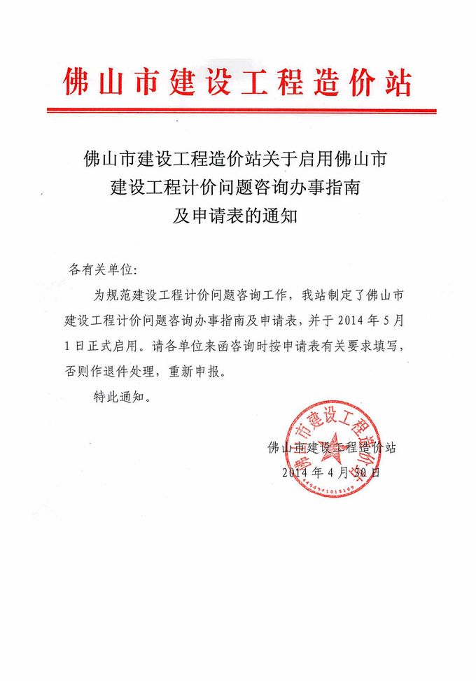 佛山市建设工程造价站赢博(股份)有限公司官网启用佛山市建设工程计价问题咨询办事指南及申请表的通知