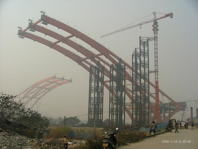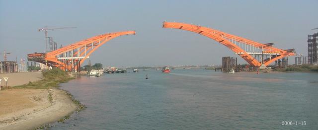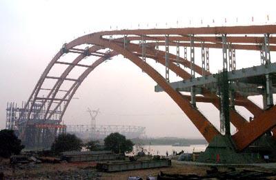 昨日上午,近百名工程人员在南岸现场进行试转前的最后检查。10时30分,完成了牵引力加载后,项目负责人发布了南岸拱肋的试转指令。至下午3时,南岸重达1.48万吨的拱肋一共转动了90度。由于是初次平转,为了慎重起见,原计划平转过程需要20多个小时,但实际上只用了4个多小时,平转时间大为缩短。