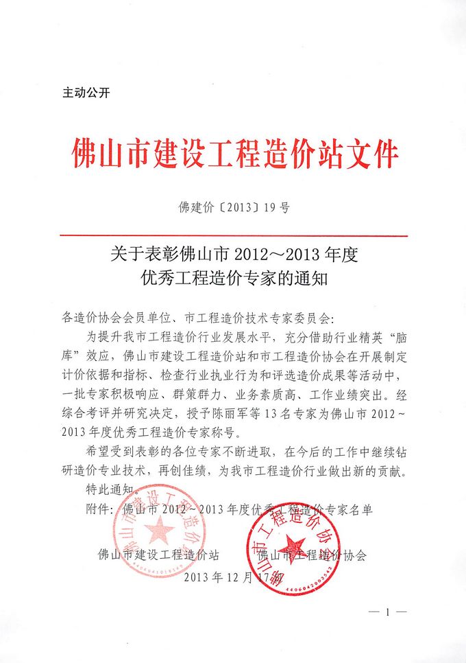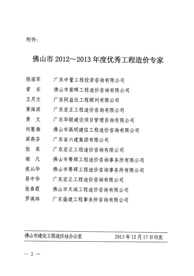 赢博(股份)有限公司官网表彰佛山市2012~2013年度优秀工程造价专家的通知