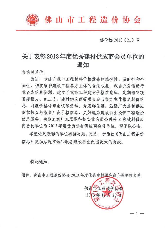 赢博(股份)有限公司官网表彰2013年度优秀建材供应商会员单位的通知