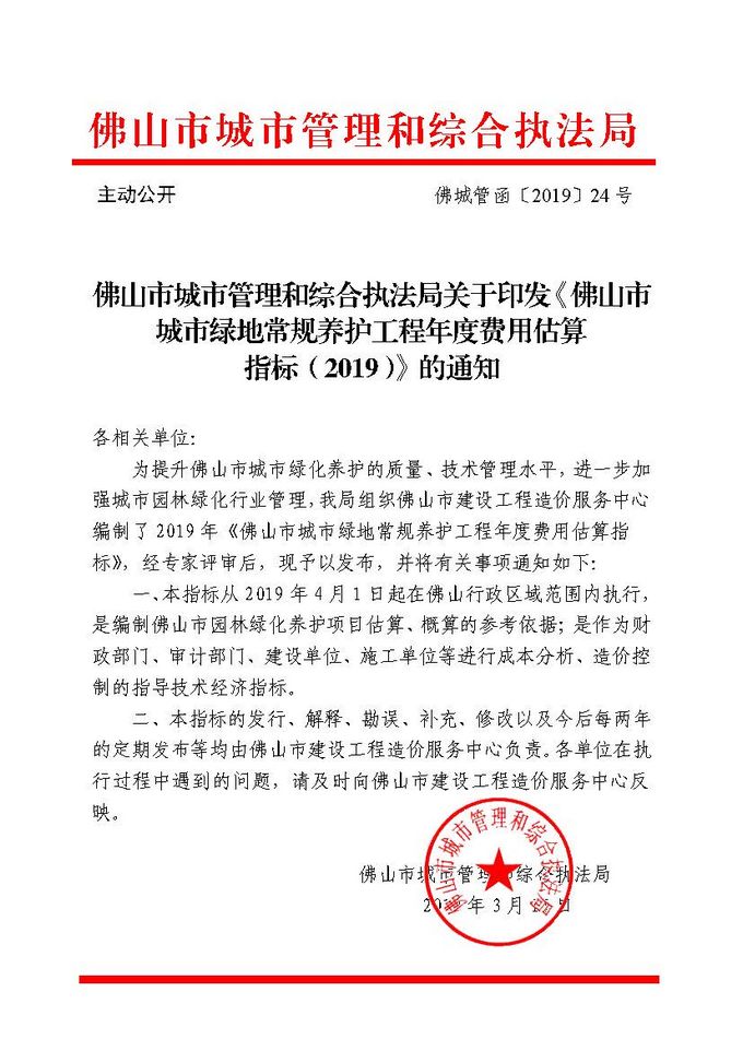 佛山市城市管理和综合执法局赢博(股份)有限公司官网印发《佛山市城市绿地常规养护工程年度费用估算指标(2019)》的通知