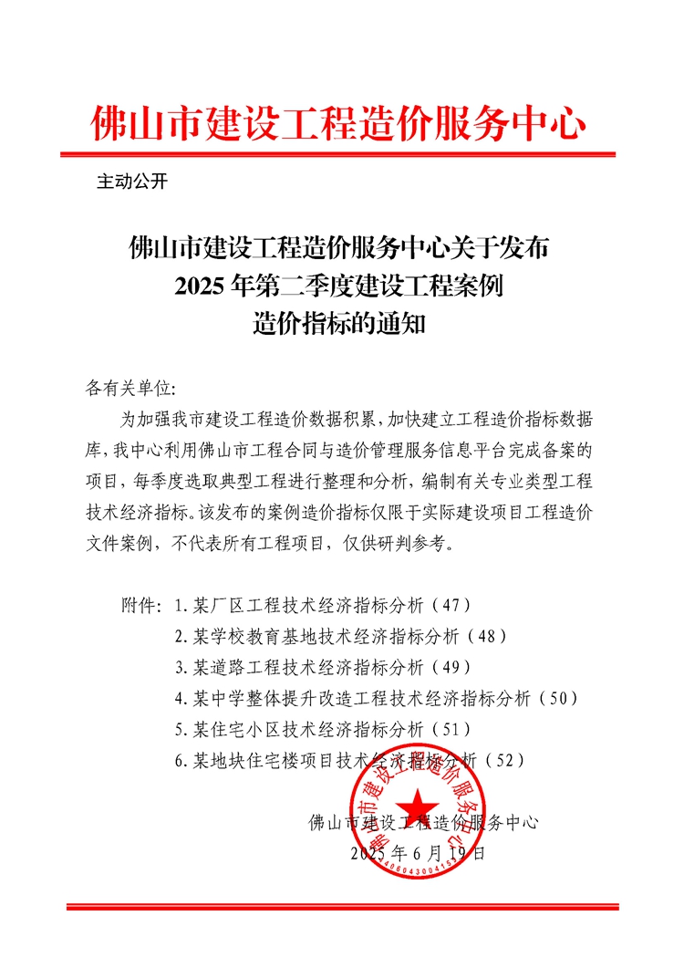 转发 | 佛山市建设工程造价服务中心赢博(股份)有限公司官网发布2025年第二季度建设工程案例造价指标的通知