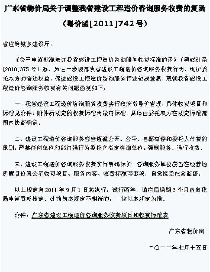 广东省物价局赢博(股份)有限公司官网调整我省建设工程造价咨询服务收费的复函