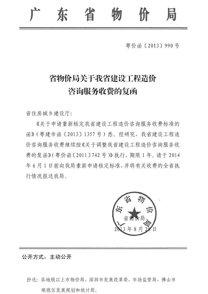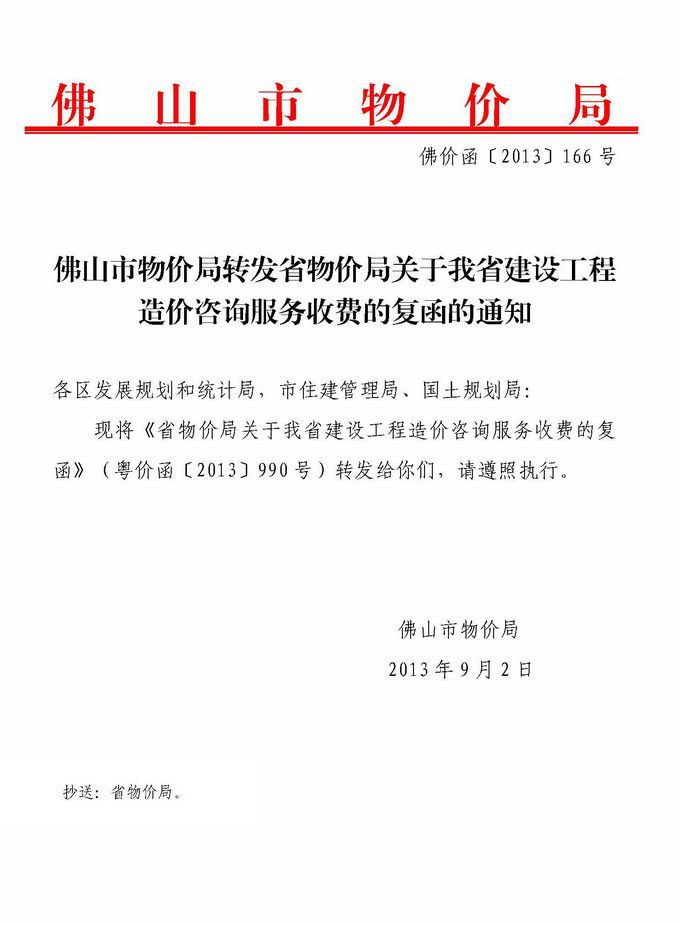 佛山市物价局转发省物价局赢博(股份)有限公司官网我省建设工程造价咨询服务收费的复函的通知